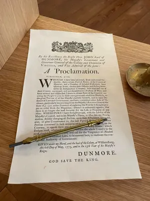 Dunmore's Proclamation displayed at Preservation Virginia's site of Scotchtown